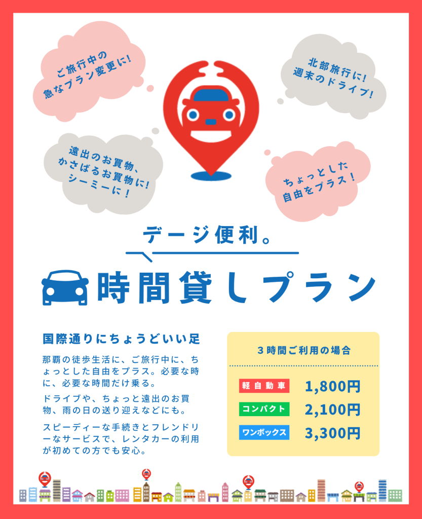 那覇の徒歩生活、ご旅行中、ちょっと遠出のお買い物やドライブ、雨の日の送り迎えなど。